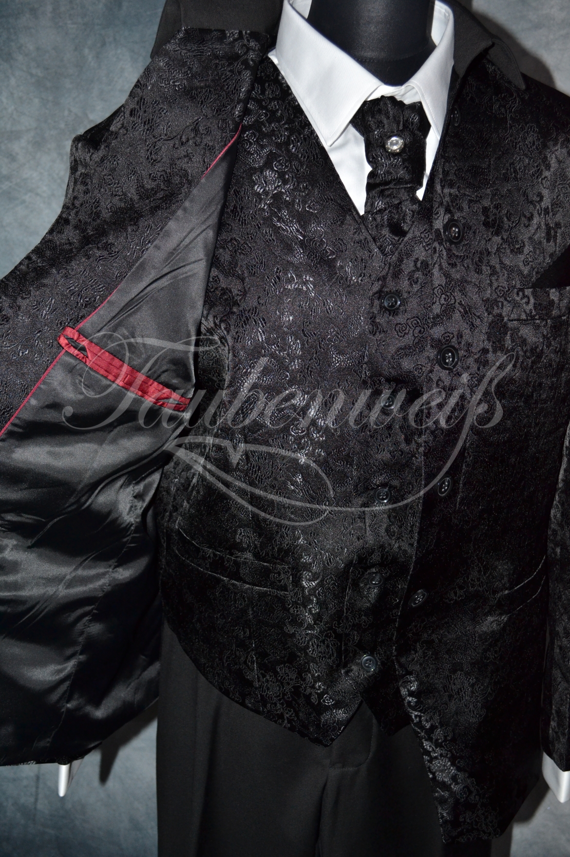 Leibhöhe: Normal Kragen: Reverskragen Verschluss: dekorative Knöpfe (werden nicht verschlossen) Taschen: Paspeltaschen, innenliegende Tasche Verschluss: Verdeckter Zip-Fly Hosentaschen: Gesäßtaschen, Seitentaschen Muster: Pailsley schwarz gemustert; Jackettkragen und Hose schwarz unifarben Details: Schulterpolster Ärmel: 4 Knöpfe an den Ärmeln Weste: 5 Knöpfe; Weitenregulierung am Rücken