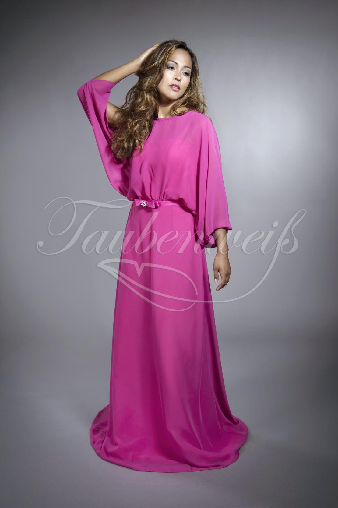 Brautjungfernkleid fuchsia bodenlang mit Schleppe Chiffon Rundhals Langarm